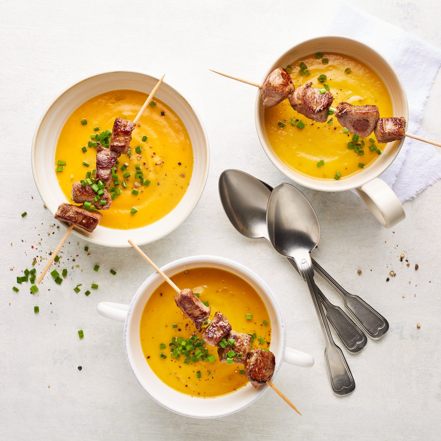 Cremige Süßkartoffelsuppe mit Lammfilet