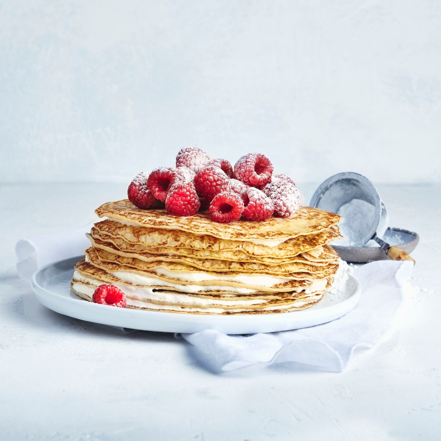 Crêpes-Torte mit Mascarpone und Himbeeren