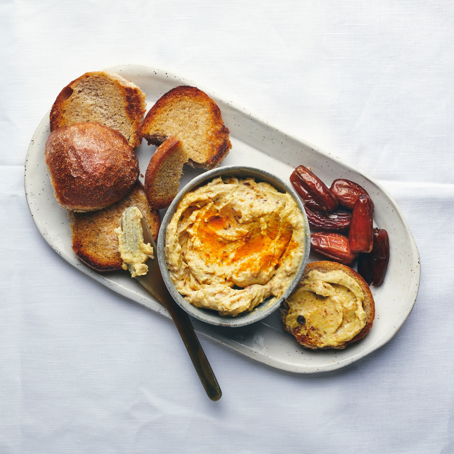 Die Datteln fein hacken. Den Frischkäse mit der Milch, den Datteln, dem Olivenöl und den Gewürzen verrühren.
