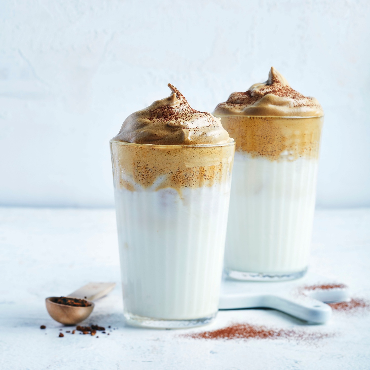 Ursprünglich kommt der cremige Dalgona Coffe aus dem südchinesischen Macao – und ist im Grunde nichts anderes als ein umgedreht zubereiteter Cappuccino: unten die Milch, oben aufgeschäumter Instantkaffee. Bei uns kommt er auf Eis! Zum Rezept