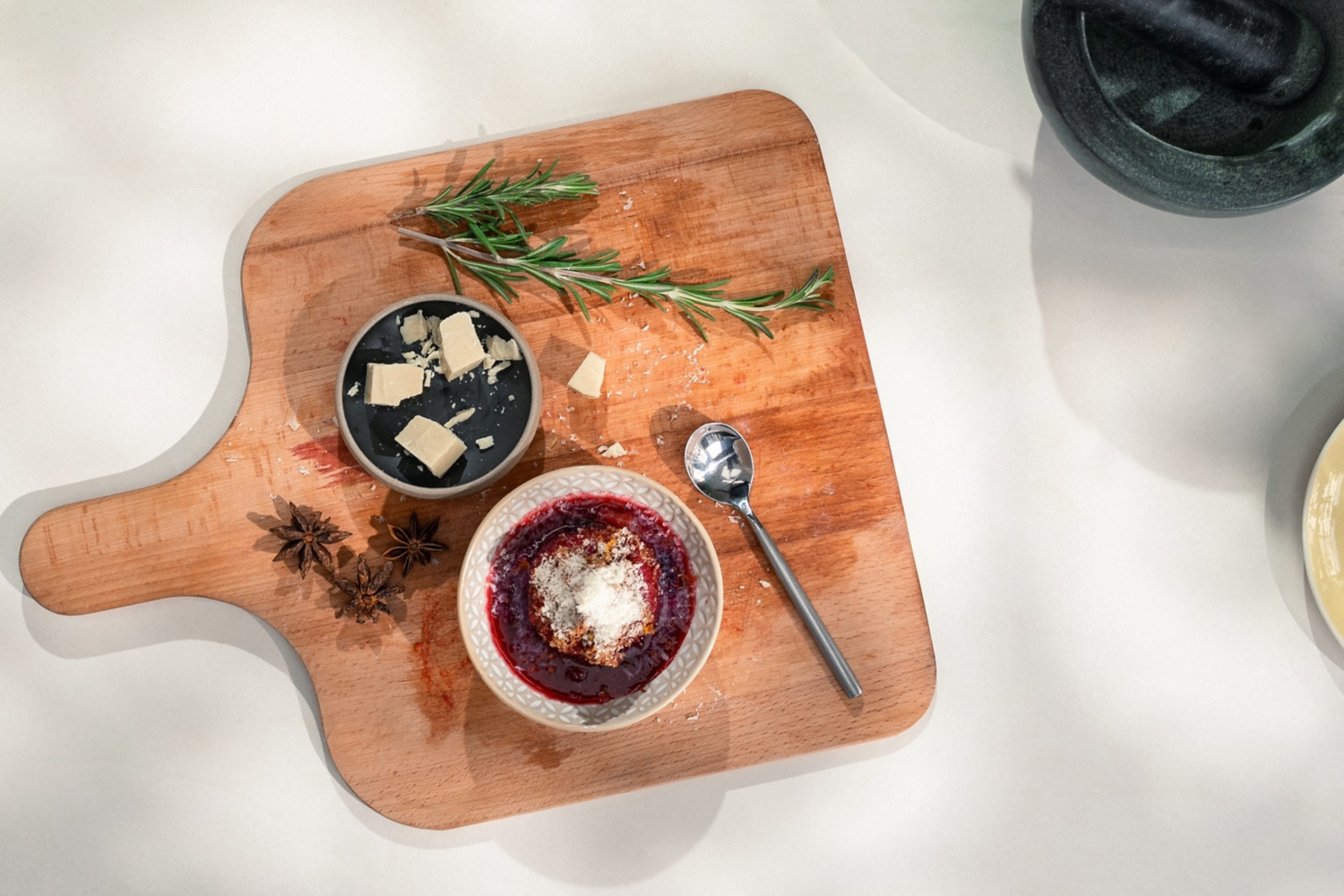 - Pflaumenkompott: Zucker karamellisieren, mit Orangensaft ablöschen. Zimtstange, Sternanis, Rosmarin und zerkleinerte Pflaumen zugeben, kurz weich dünsten. Mit Rote-Bete-Saft verfeinern.