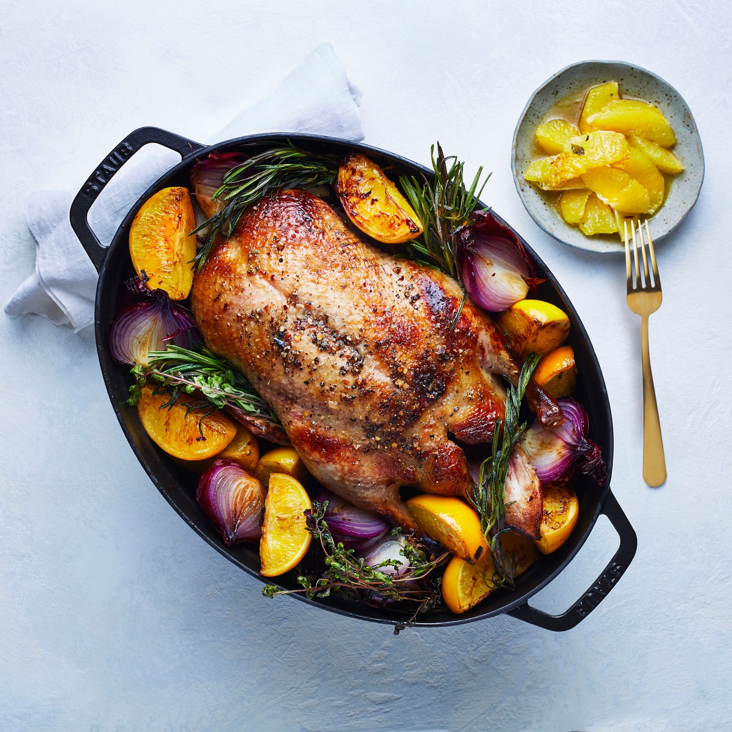 - 2 Orangen abwaschen, würfeln und die Ente damit füllen. Die Öffnung mit Zahnstochern verschließen.