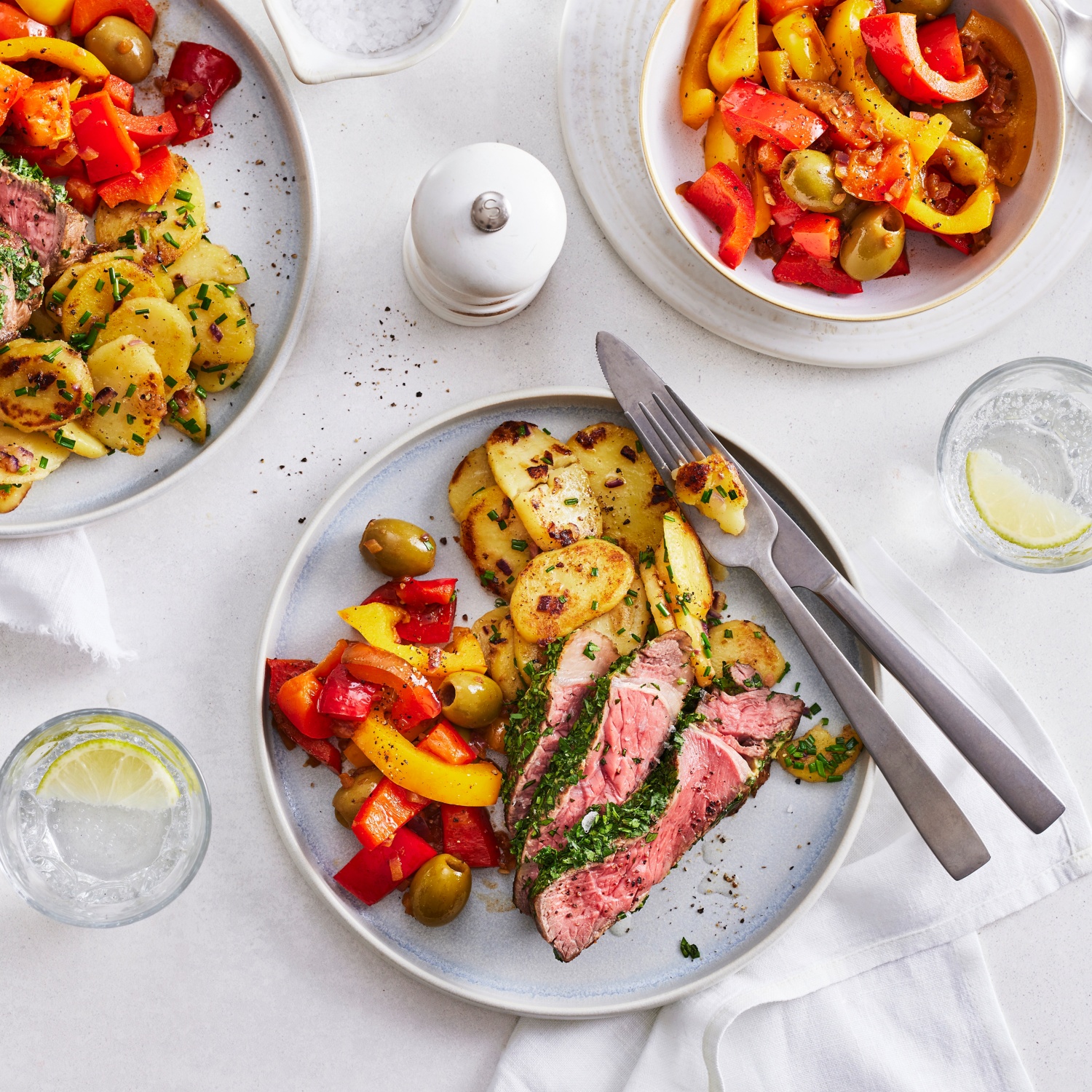 Entrecôte-Braten mit Paprikagemüse und Bratkartoffeln
