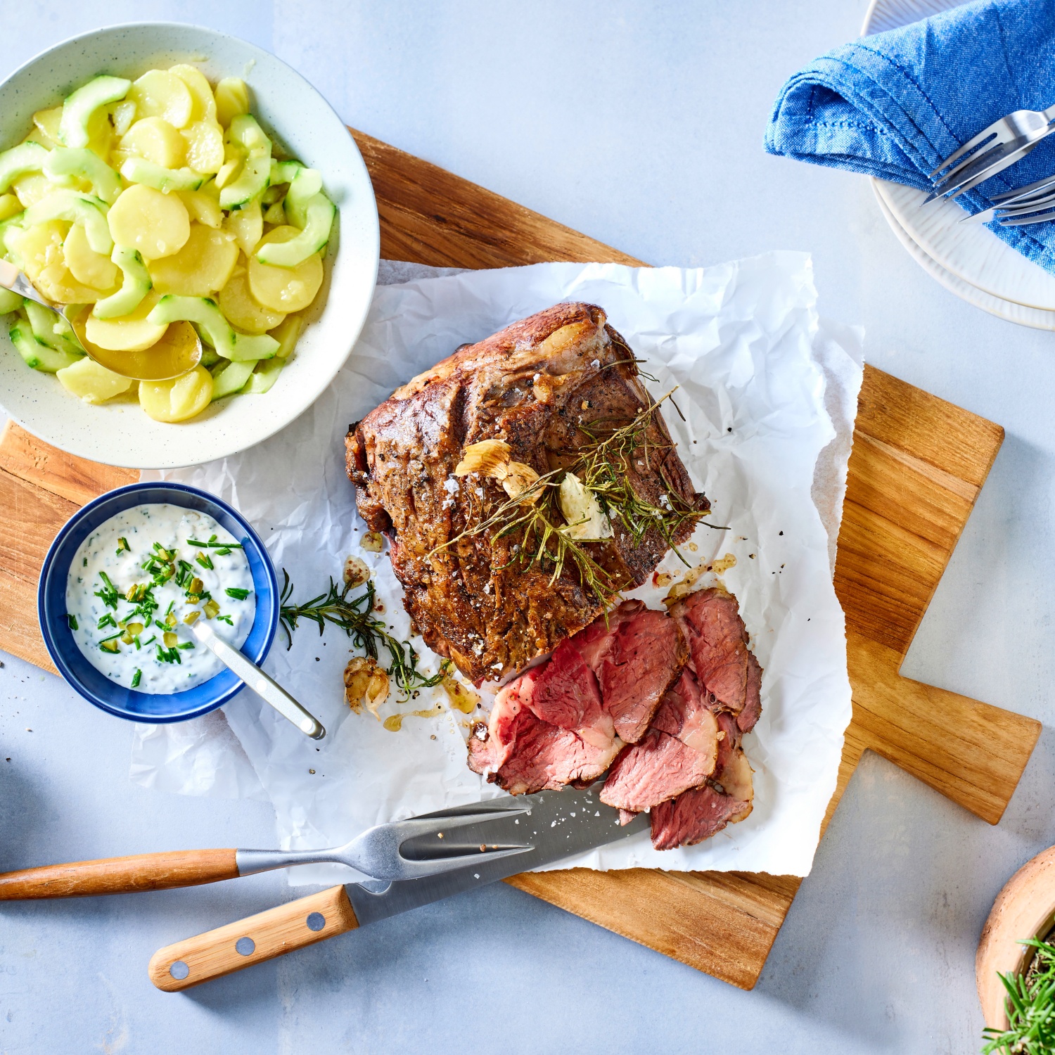 Entrecôte-Braten mit Remoulade und Kartoffel-Gurken-Salat