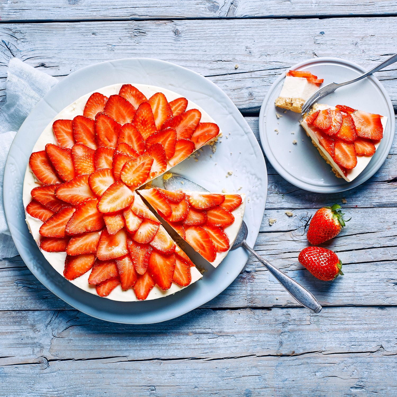 Erdbeer-Frischkäse-Torte: eine sommerliche, leichte Torte mit dem fantastischen und frischen Geschmack. Ganz ohne Backen ist die Torte einfach zubereitet. Zum Rezept
