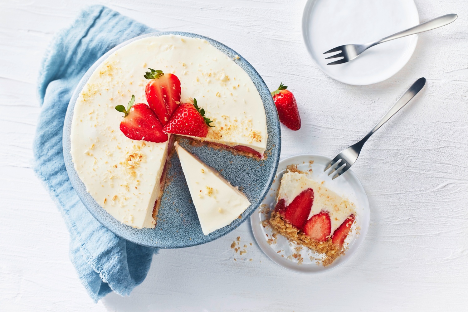 - Vor dem Servieren 2 EL Kokosraspeln in einer Pfanne anrösten und den Cheesecake damit bestreuen. Mit ganzen Erdbeeren nach Belieben dekorieren.