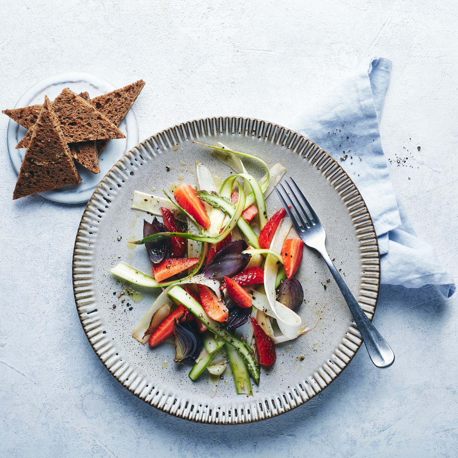 - Den Spargel mit dem Spargelschäler längs in dünne Scheiben schneiden und zusammen mit den Zwiebeln und den Erdbeeren in die Marinade geben. Vorsichtig vermengen und auf Tellern oder einer Platte anrichten. Mit buntem Pfeffer und Minzblättern garnieren und servieren.