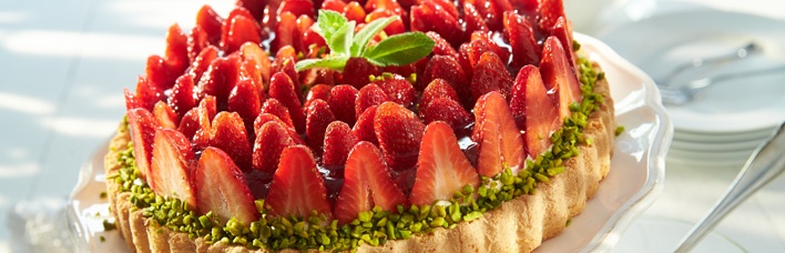 - Die Erdbeeren waschen, gut abtropfen lassen und halbieren oder vierteln. Erdbeeren auf der ausgekühlten Creme verteilen. Den Tortenguss nach Packungsanleitung mit Wasser, Weißwein oder Sekt zubereiten und auf den Erdbeeren verteilen.