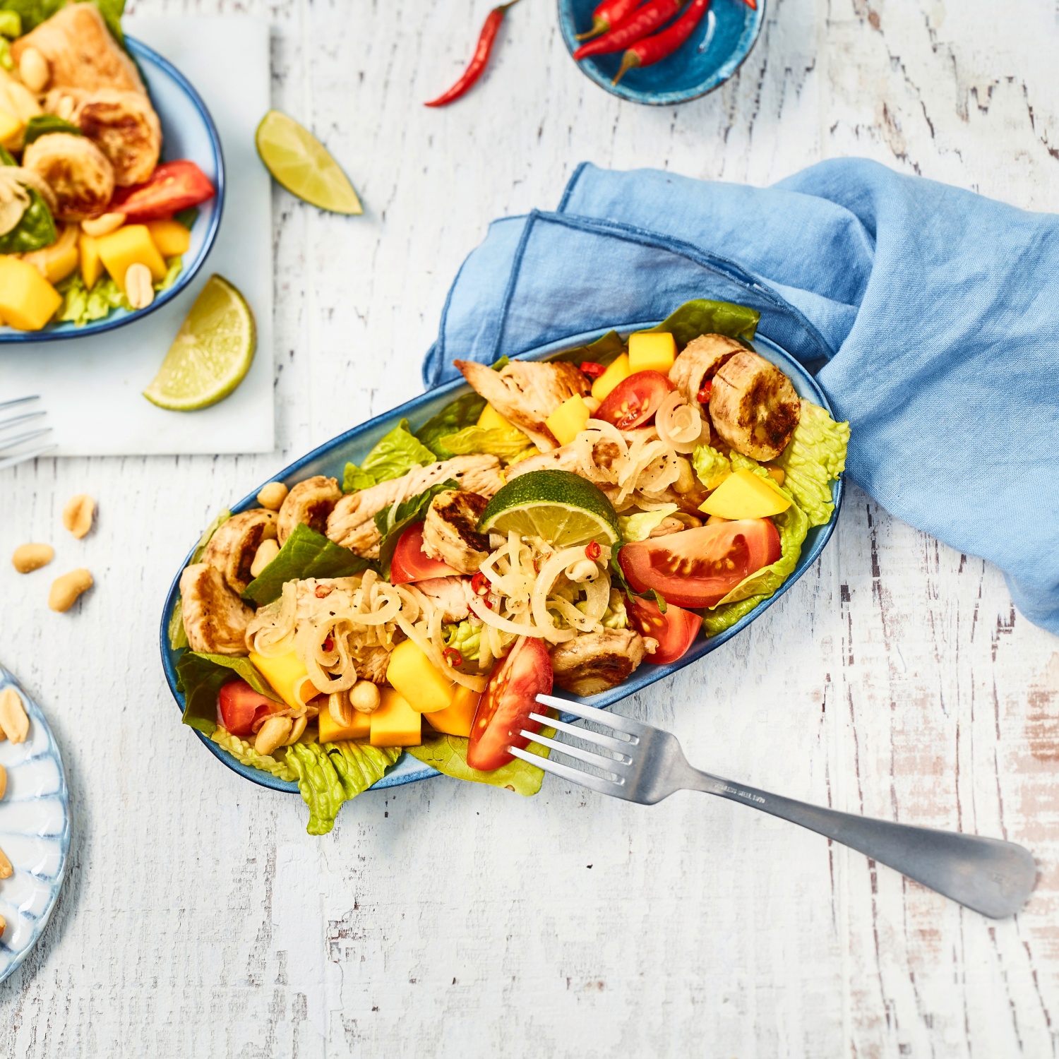 - Bananen schälen, in Scheiben schneiden und mit etwas Limettensaft beträufeln. Salat putzen, waschen und zerzupfen. Tomaten waschen, putzen und in Spalten schneiden. Zwiebel schälen und in Streifen schneiden. Mango schälen, Fruchtfleisch vom Stein schneiden und würfeln. Chilischote fein hacken. Knoblauch schälen und durch eine Knoblauchpresse drücken.