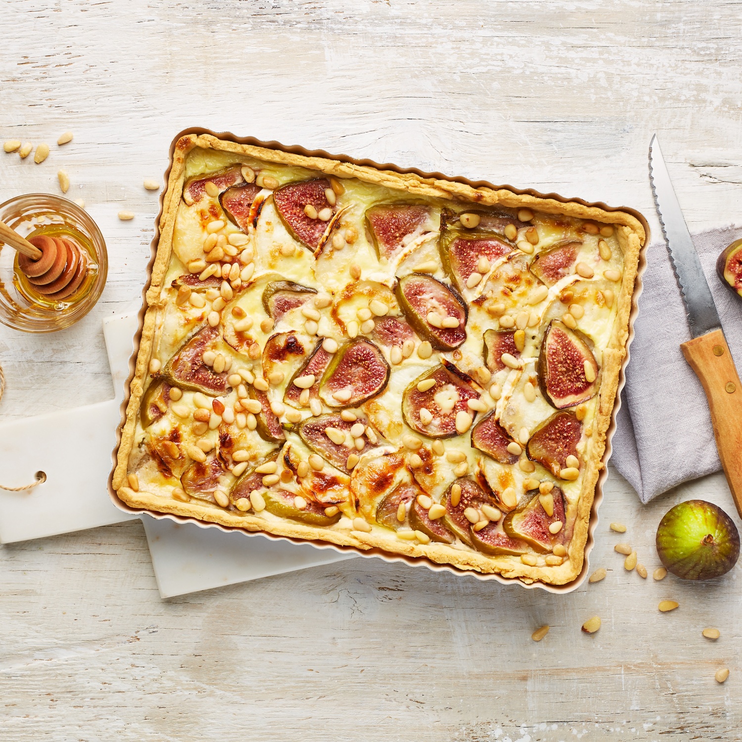 - Die Feigen-Tarte mit Ziegenkäse im vorgeheizten Ofen bei 220 °C Ober- und Unterhitze (200 °C Umluft) 25-30 Minuten backen. In den letzten 10 Minuten der Backzeit die Pinienkerne aufstreuen und mitbacken.