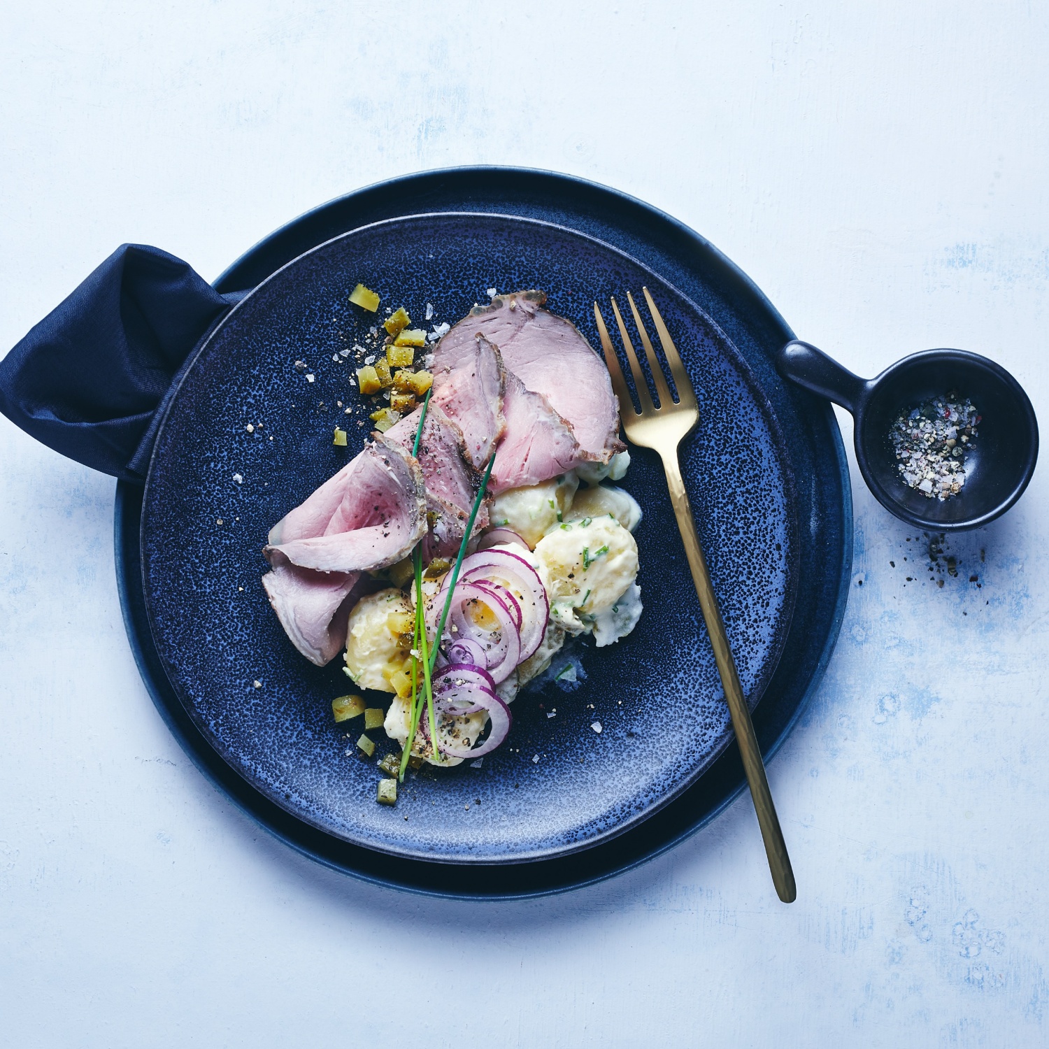 - Das Fleisch aus der Folie wickeln und in ganz feine Scheiben schneiden.