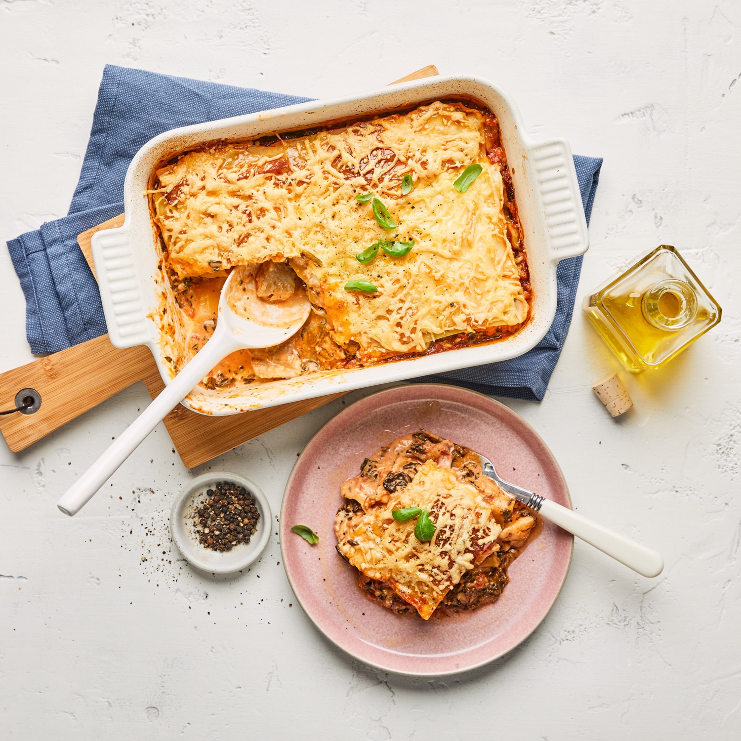 - Die Lasagne mit dem Reibekäse bestreuen und im vorgeheizten Ofen bei 180 °C Umluft (200 °C Ober- und Unterhitze) 30-40 Minuten goldbraun backen.
