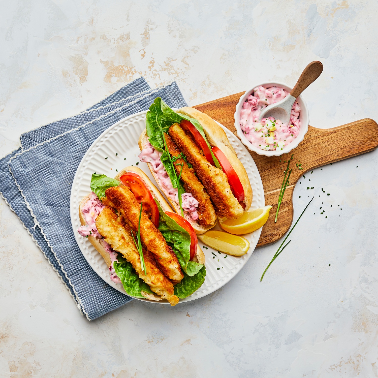 - Die Brötchen im Ofen aufbacken und aufschneiden (nicht ganz durchschneiden). Die Brötchen mit Remoulade bestreichen und je einen Backfisch, 2–3 Tomatenscheiben und 1–2 Salatblätter hineingeben. Sofort genießen!