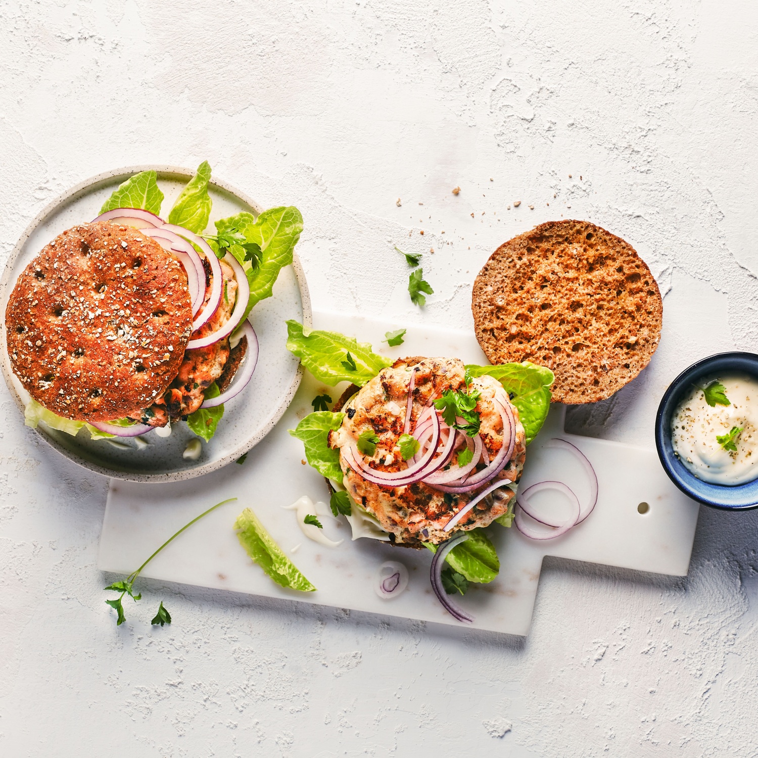 Auf die Burger, fertig, los! Diese Fischburger aus Lachs und leckeren Roggenbrötchen können sich sehen und schmecken lassen – nicht nur auf dem Osterbüfett. Zum Rezept