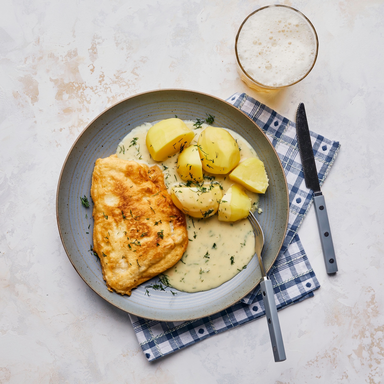 Würzig, knusprig und rustikal – so schmeckt Fischfilet im Bierteig mit cremiger Dillsauce, serviert mit Salzkartoffeln. Zum Rezept
