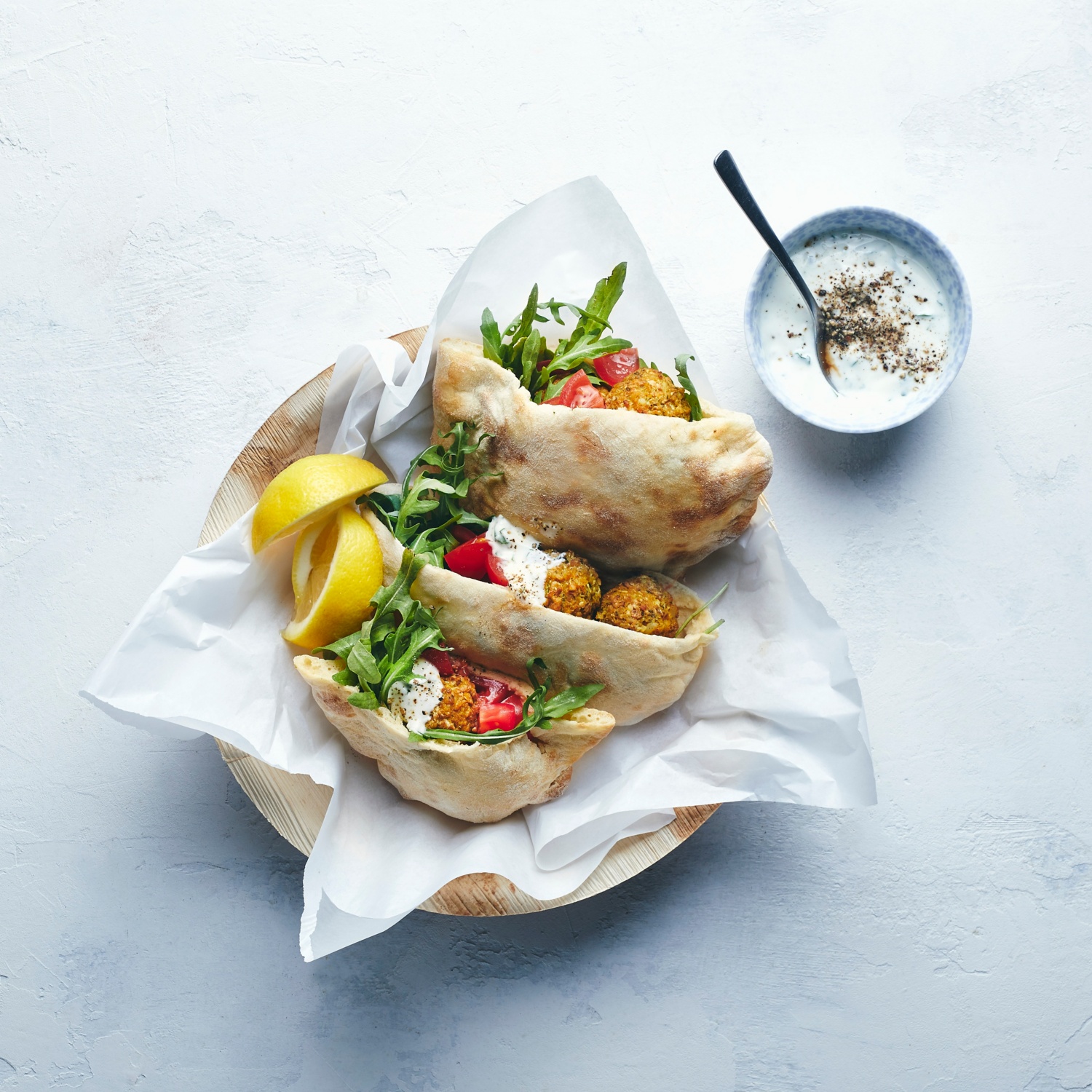 Picknick mal orientalisch: Das weiche Fladenbrot lässt sich vor Ort mit den Falafelbällchen und Salat füllen. Ein Klecks Sauce rundet dieses Streetfood perfekt ab. Zum Rezept