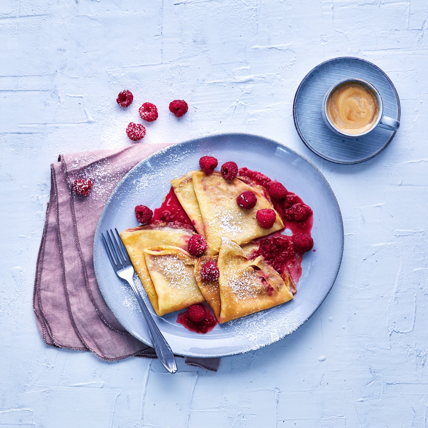 - Die flambierten Crêpes auf einem Teller mit der Himbeersauce servieren und mit Puderzucker bestreuen.