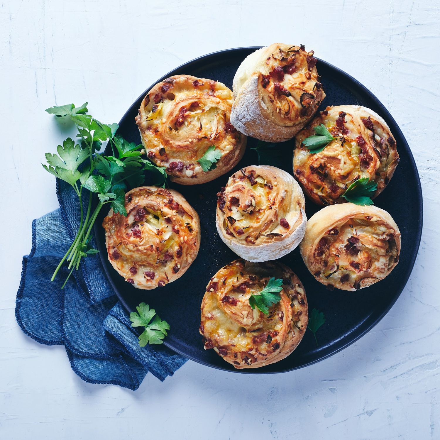 4. Anschließend in feine Ringe schneiden und auf den Pizzateigen verteilen. Gleichmäßig beide Teige mit Käse bestreuen und von der langen Seite her fest aufrollen. Jede Teigrolle in 12 Stücke schneiden. Zwei Backbleche mit Backpapier auslegen.