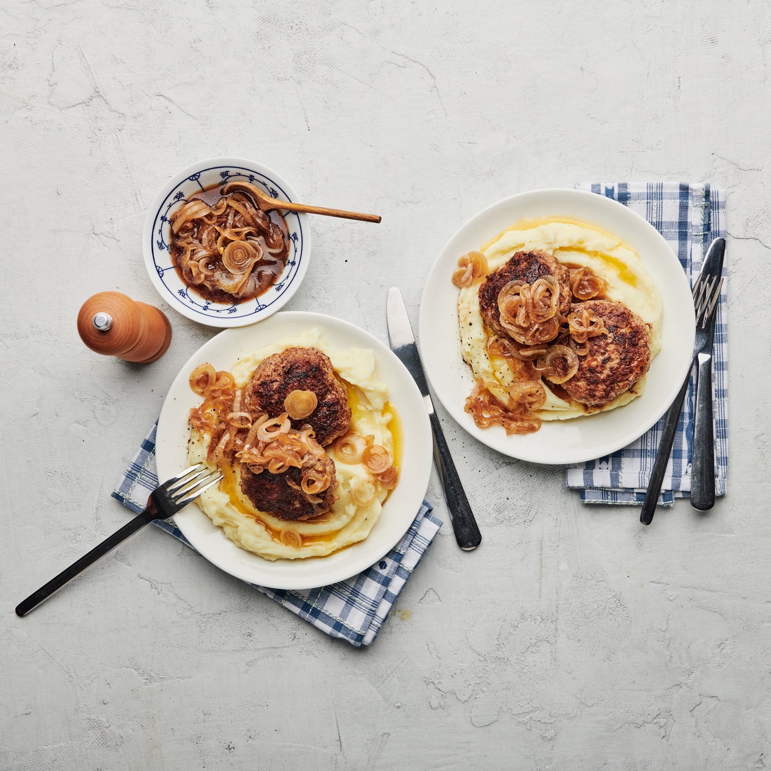 Fleischpflanzerl mit Kartoffelstampf und Karamellzwiebeln
