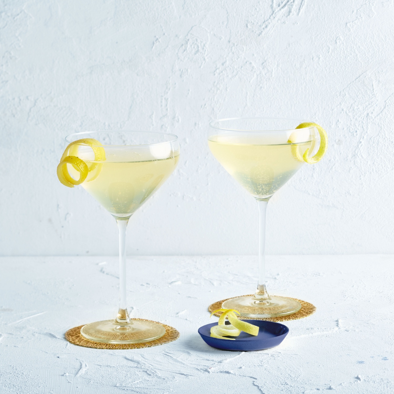3. Den Mix in ein Champagnerglas abseihen, mit dem Champagner aufgießen und mit der Zitronenzeste garniert servieren.