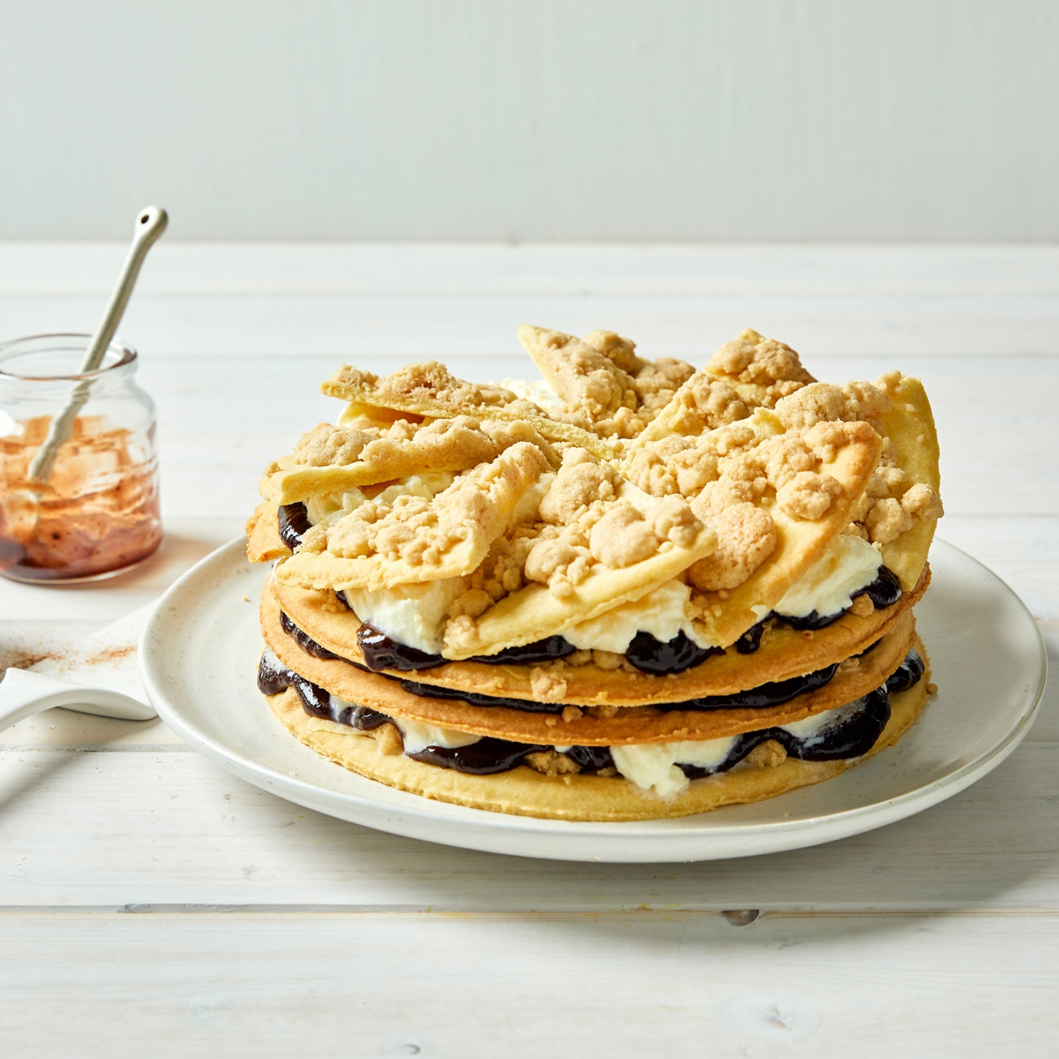 - Den ersten Boden mit einem Drittel Pflaumenmus und anschließend mit einem Drittel der Sahne bestreichen. Den zweiten Boden auflegen ebenso schichten. Die 8 Bodenstücke schräg auf die letzte Sahneschicht setzten. Mindestens 30 Minuten kaltstellen.