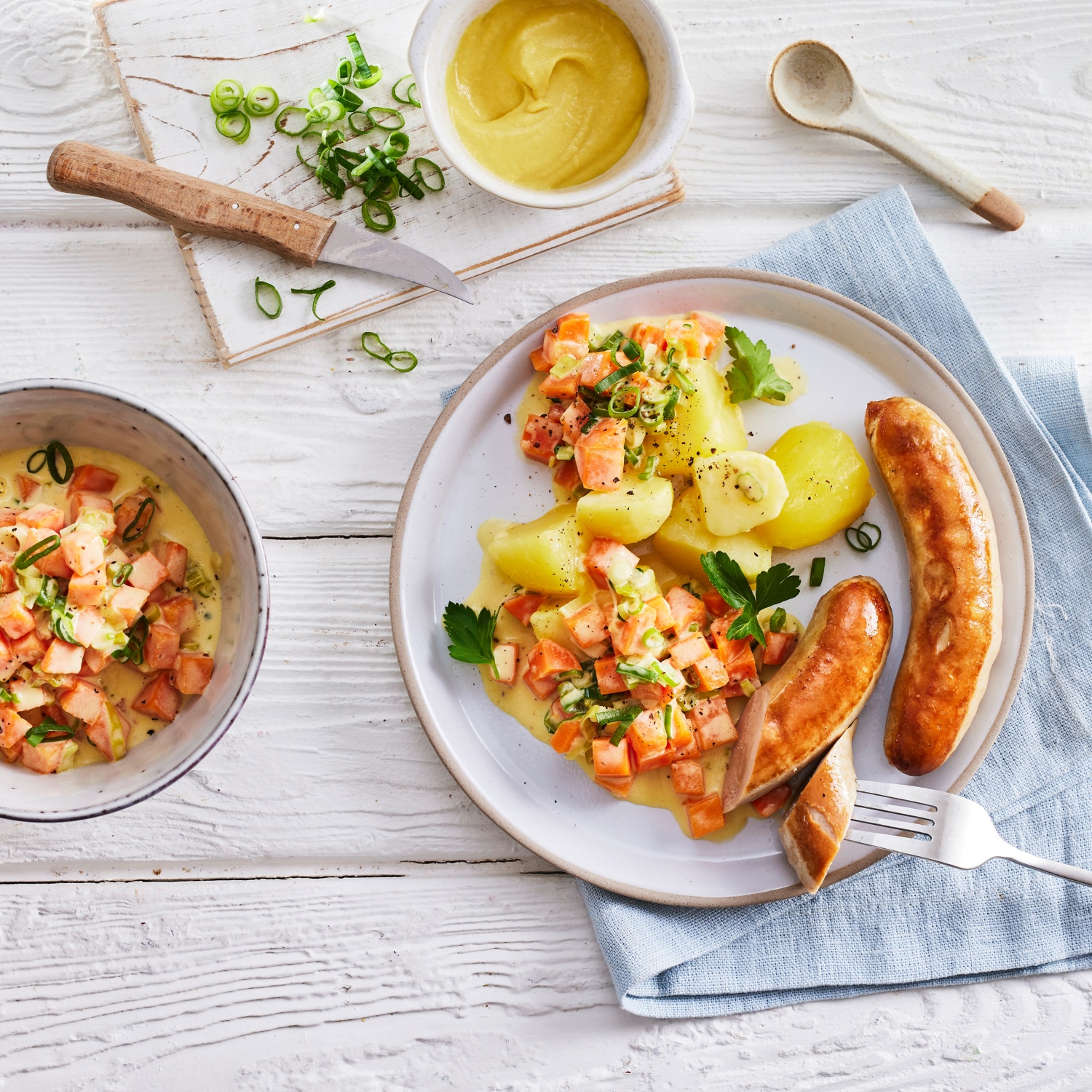 - Bratwürste in 1 EL Oliven-Öl goldbraun braten, Kartoffeln abgießen. Senf in das Möhrengemüse einrühren und die grünen Frühlingszwiebelringe unterheben. Kartoffeln, Möhrengemüse und Bratwurst zusammen anrichten, nach Geschmack mit frischen Kräutern dekorieren.