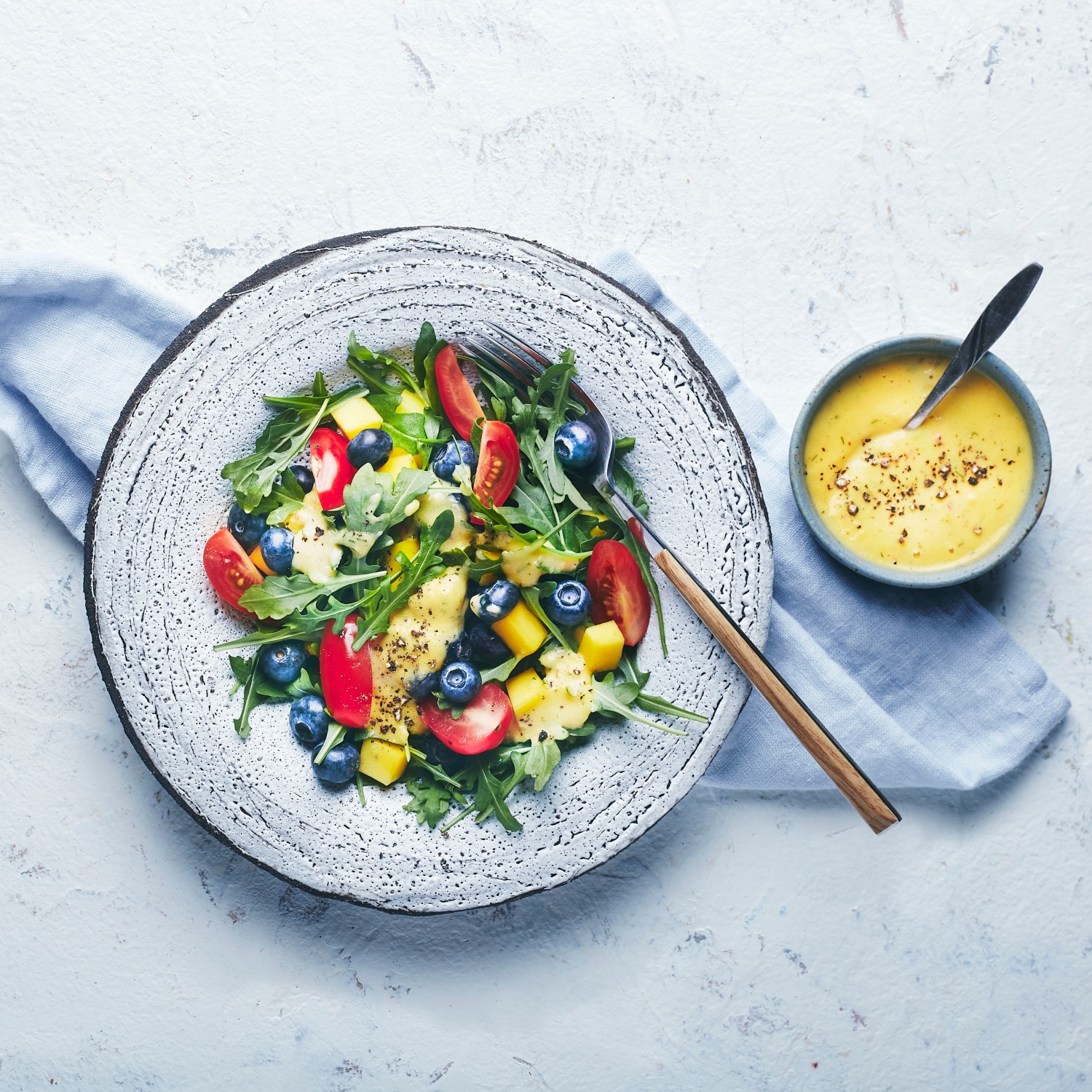 - Den Rucolasalat, die Tomaten, die restlichen Mangowürfel und die Heidelbeeren vermengen. Mit dem Mango-Dressing servieren.
