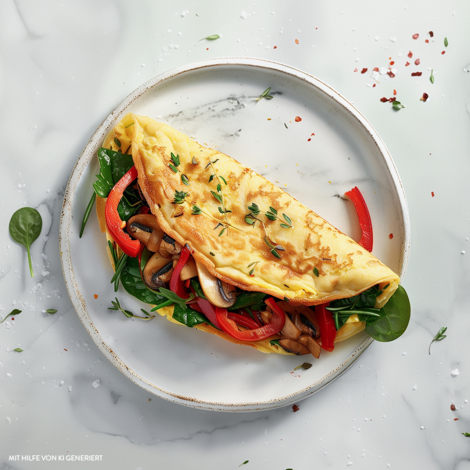 - Sobald das Omelett an der Unterseite leicht gebräunt ist, das Gemüse darauf geben, zur Hälfte umklappen und weitere 1-2 Minuten braten, bis das Omelett durchgegart ist.