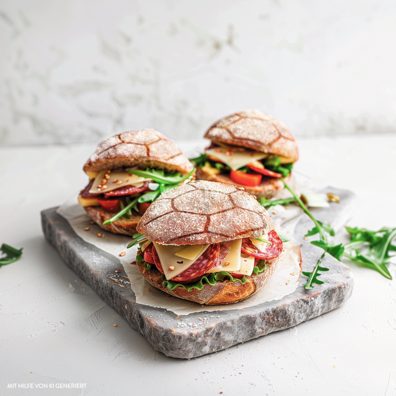 • Die Brötchen etwas abkühlen lassen und aufschneiden. Mit Butter bestreichen und ganz nach Geschmack zum Beispiel mit Salat, mit Salami, Käse und Tomatenscheiben belegen. Fertig ist der leckere Fußball-Snack!