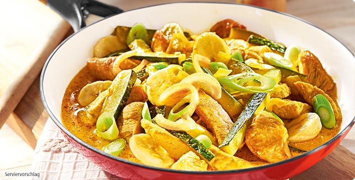 - Curry- und Paprikapulver mit in die Pfanne geben und kurz mitschwitzen lassen. Creme fraiche oder Sahne, sowie Brühe und Saft angießen, aufkochen und ca. 6-8 Minuten köcheln lassen.