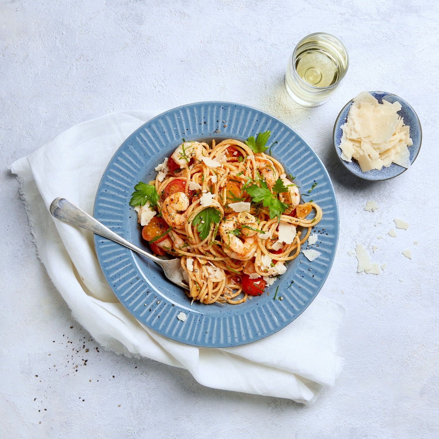 Gambas „Italia“ mit Spaghetti aglio olio mit Kirschtomaten