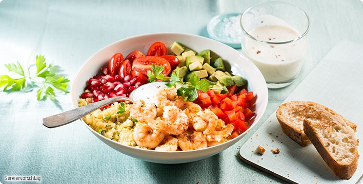 Garnelen-Bowl mit Couscous, Avocado und Granatapfel