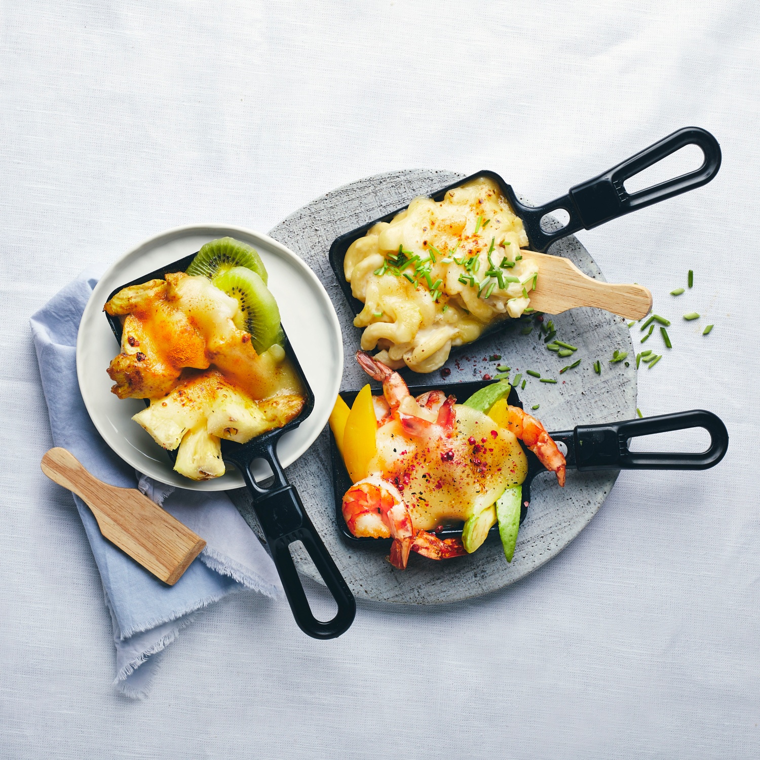 - Die Mango und die Avocado schälen und klein schneiden. Auf vier Raclettepfännchen verteilen. Mit den Garnelen und je 1 Scheibe Käse überbacken.