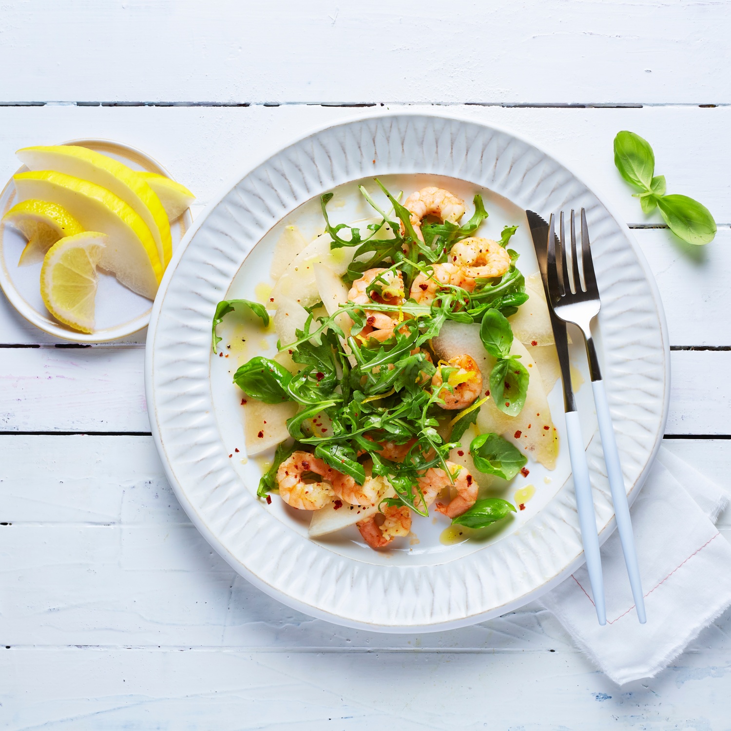 - Die Melonenspalten mit dem Salat und dem Basilikum auf einem Teller anrichten, die Garnelen darauf verteilen. Das Dressing darübergeben und servieren.