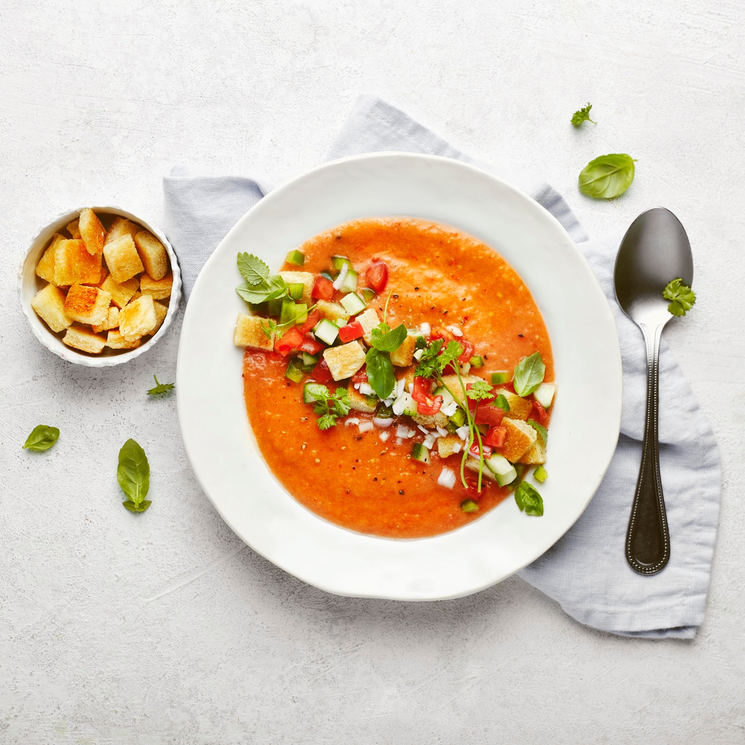 - Die Gazpacho mit Salz, Pfeffer, Zucker und etwas Zitronensaft (frisch gepresst) abschmecken. Mit den Croûtons, Zwiebel-, Paprika-, Tomaten- und Gurkenwürfeln bestreuen und mit Basilikum und Petersilie garniert servieren.