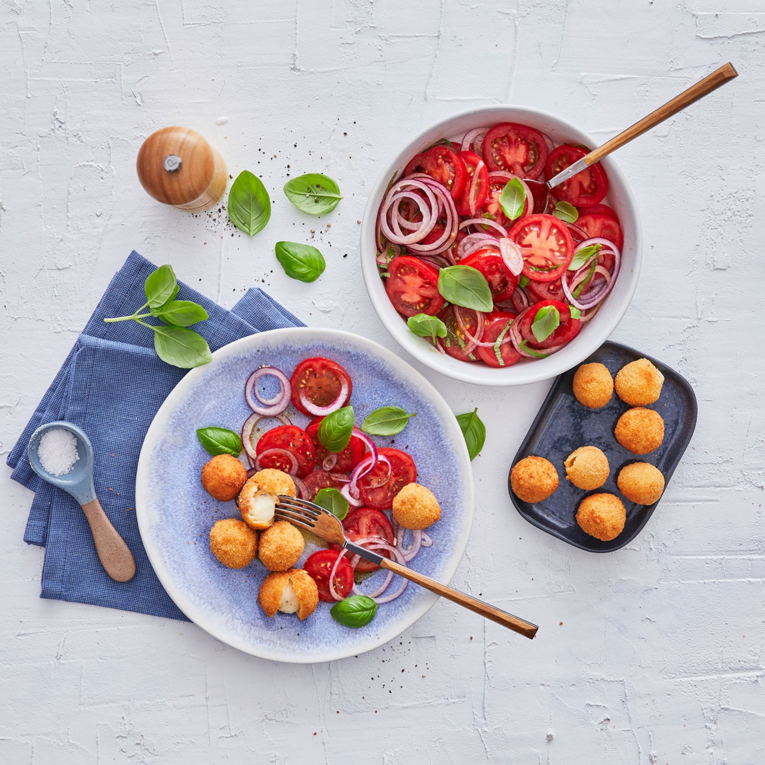 Gebackene Mozzarella-Kugeln mit Tomatensalat