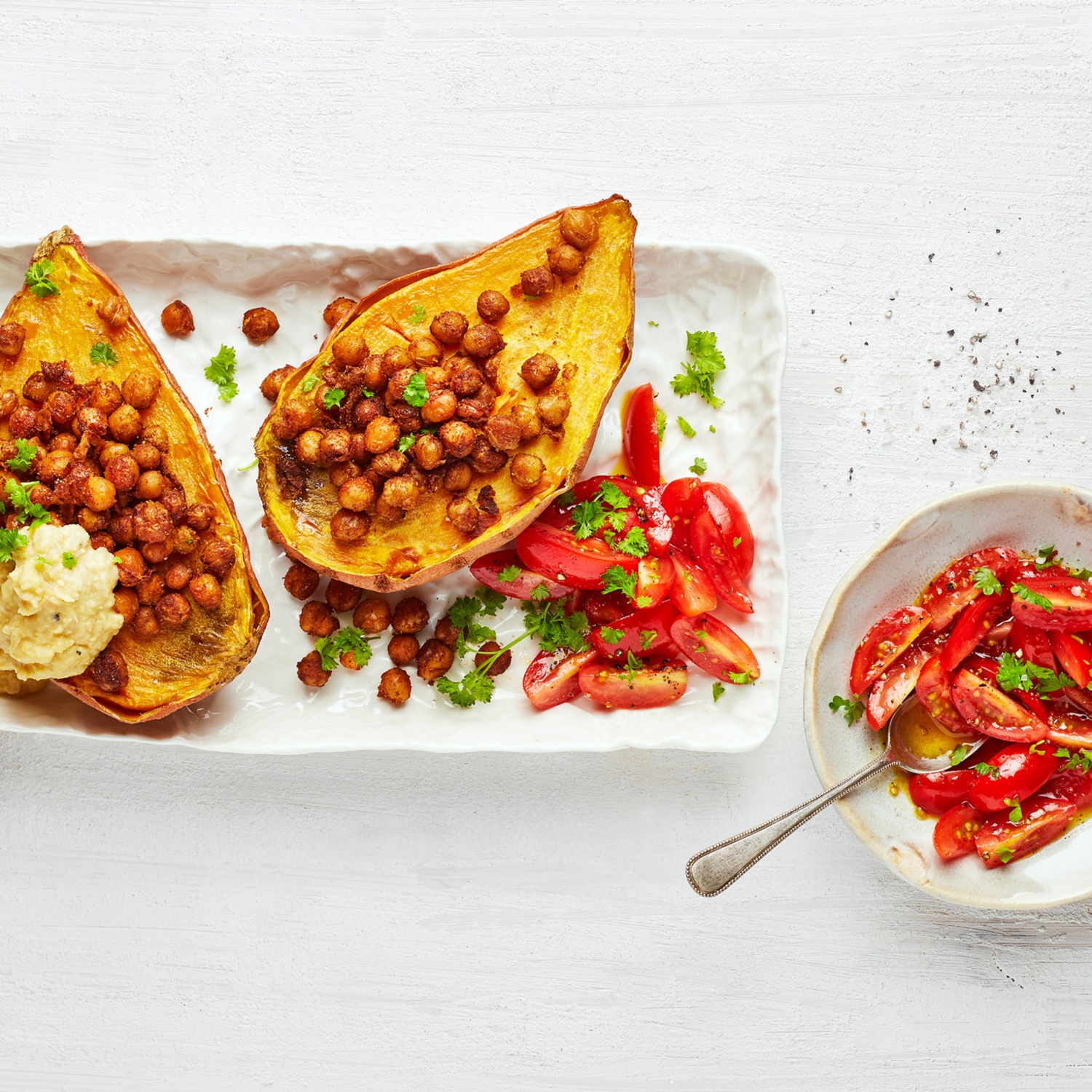 5. Wenn die Süßkartoffeln weich sind, mit einer Gabel etwas eindrücken, darauf die gerösteten Kichererbsen geben, mit der Sauce überziehen und zusammen mit den Datteltomaten anrichten.
