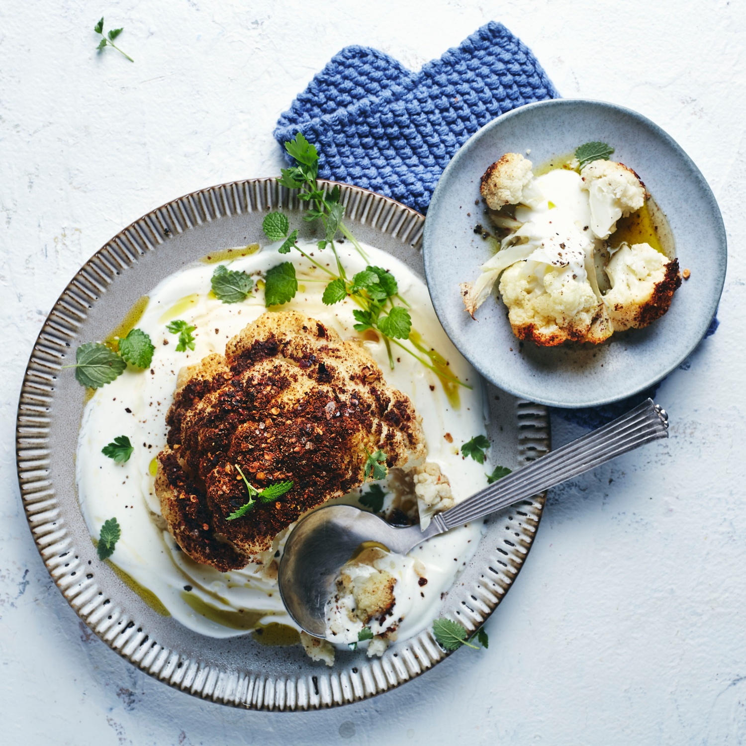 Der Star am Küchenhimmel: Gebackener Blumenkohl mit exotischen Gewürzen auf cremiger Zitronen-Joghurt-Sauce. Durch das lange Garen im Ofen bekommt der Blumenkohl eine angenehm süße Note.