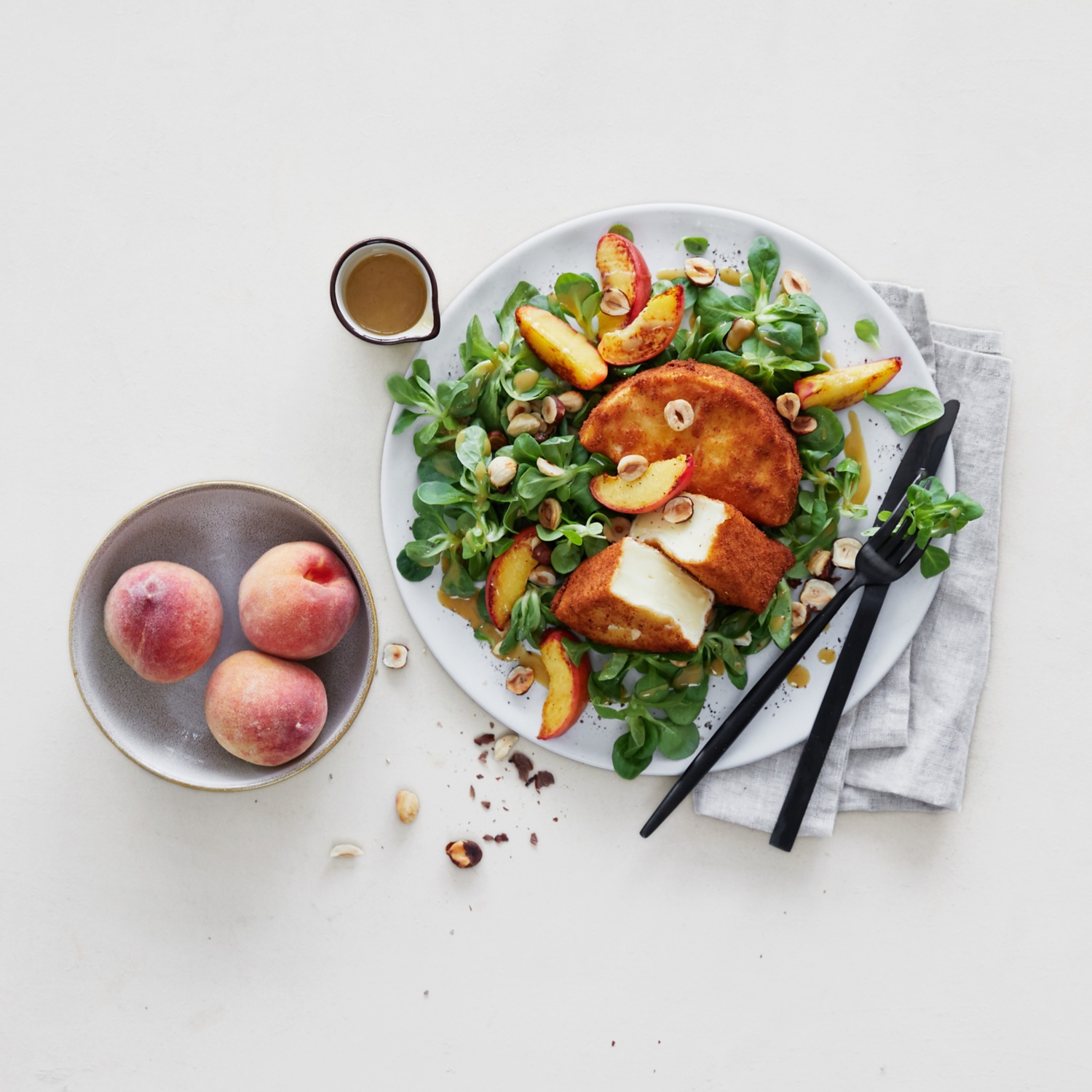 Gebackener Camembert mit Pfirsich und Feldsalat