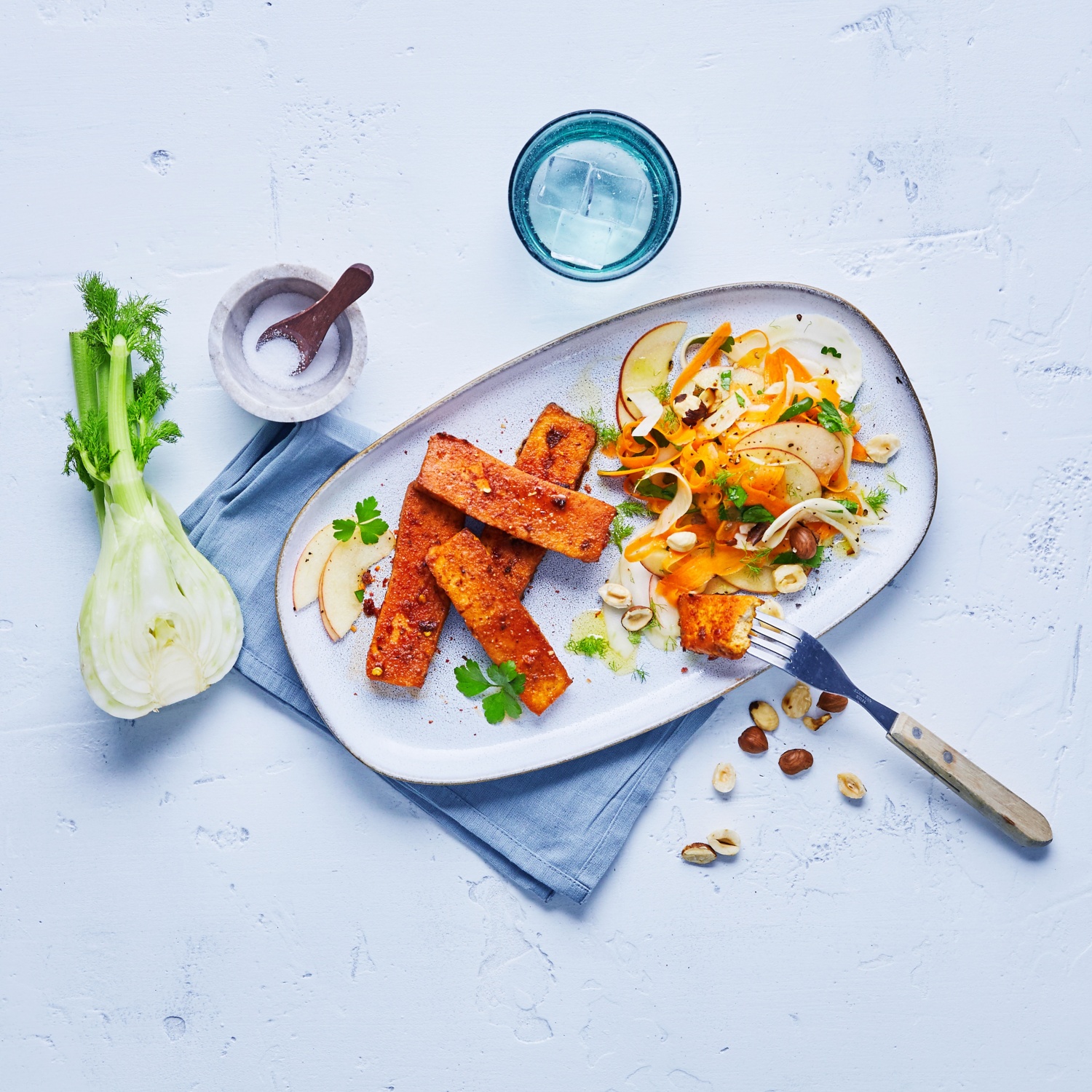 4. Für den Salat die Möhren schälen und mit dem Sparschäler in sehr feine Streifen schneiden. Den Apfel waschen und entkernen. Den Fenchel putzen. Den Apfel und den Fenchel ebenfalls in feine Streifen schneiden.