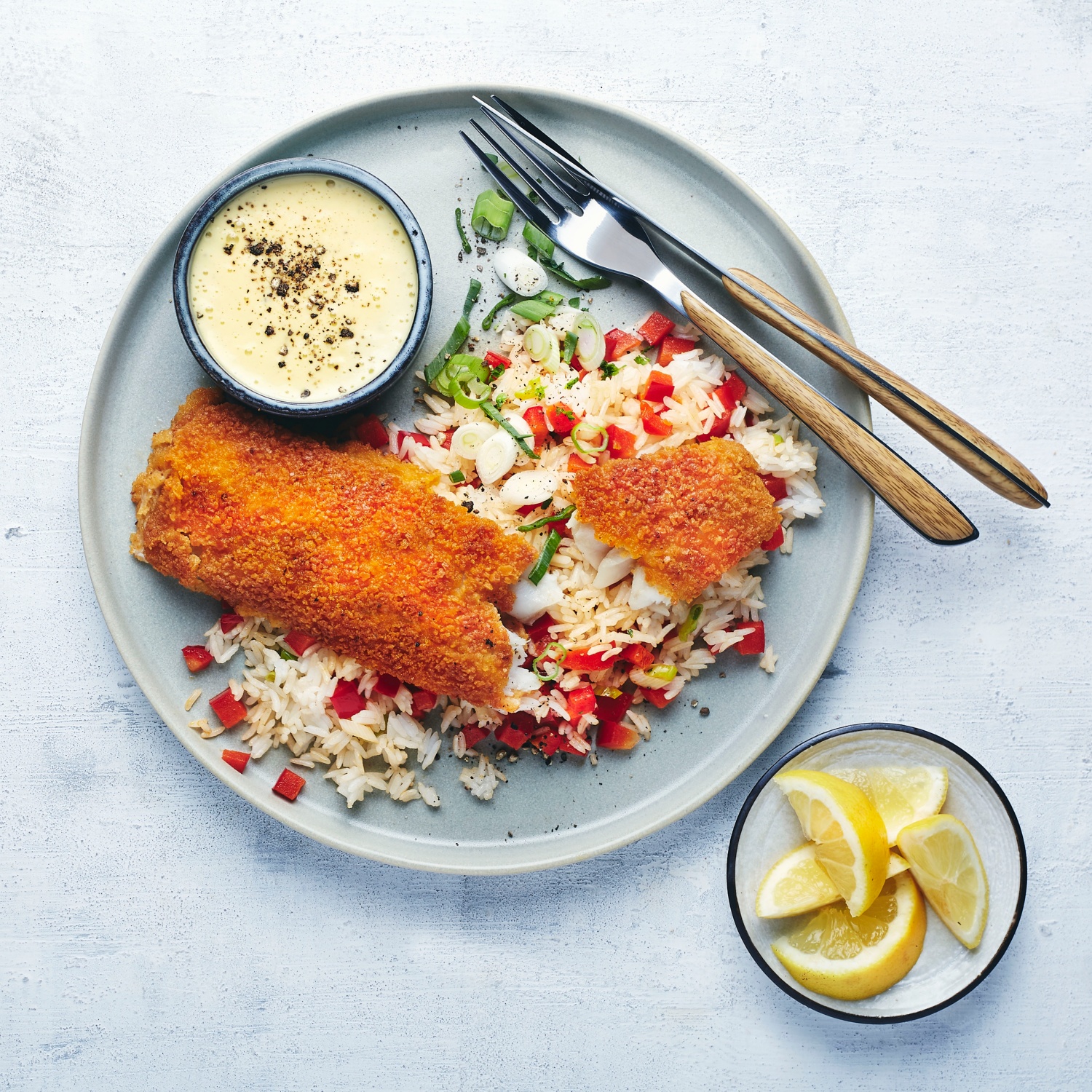 Gebackenes Fischfilet in Knusperpanade mit Thaimayonnaise und Pimento-Reis