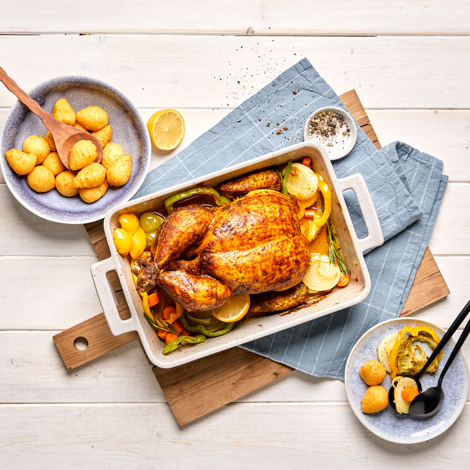 - Den Bräter aus dem Ofen nehmen. Das Hähnchen mit dem restlichen Zitronensaft beträufeln und mit den Kroketten und dem Röstgemüse servieren.