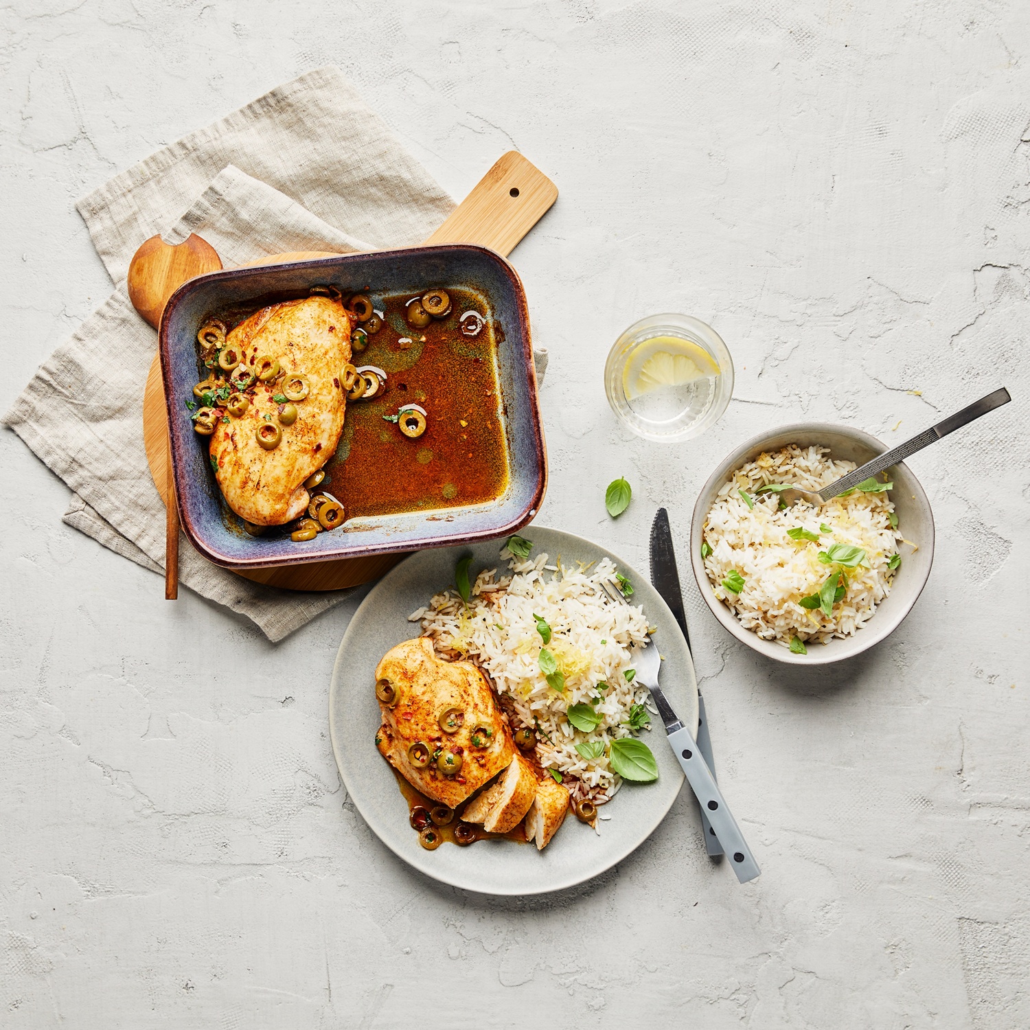 Deine Feierabend-Auszeit – fast wie in Italien: Mediterrane Hähnchenbrust mit Knoblauch und Oliven zu Zitronenreis mit Basilikum. Delizioso! Zum Rezept