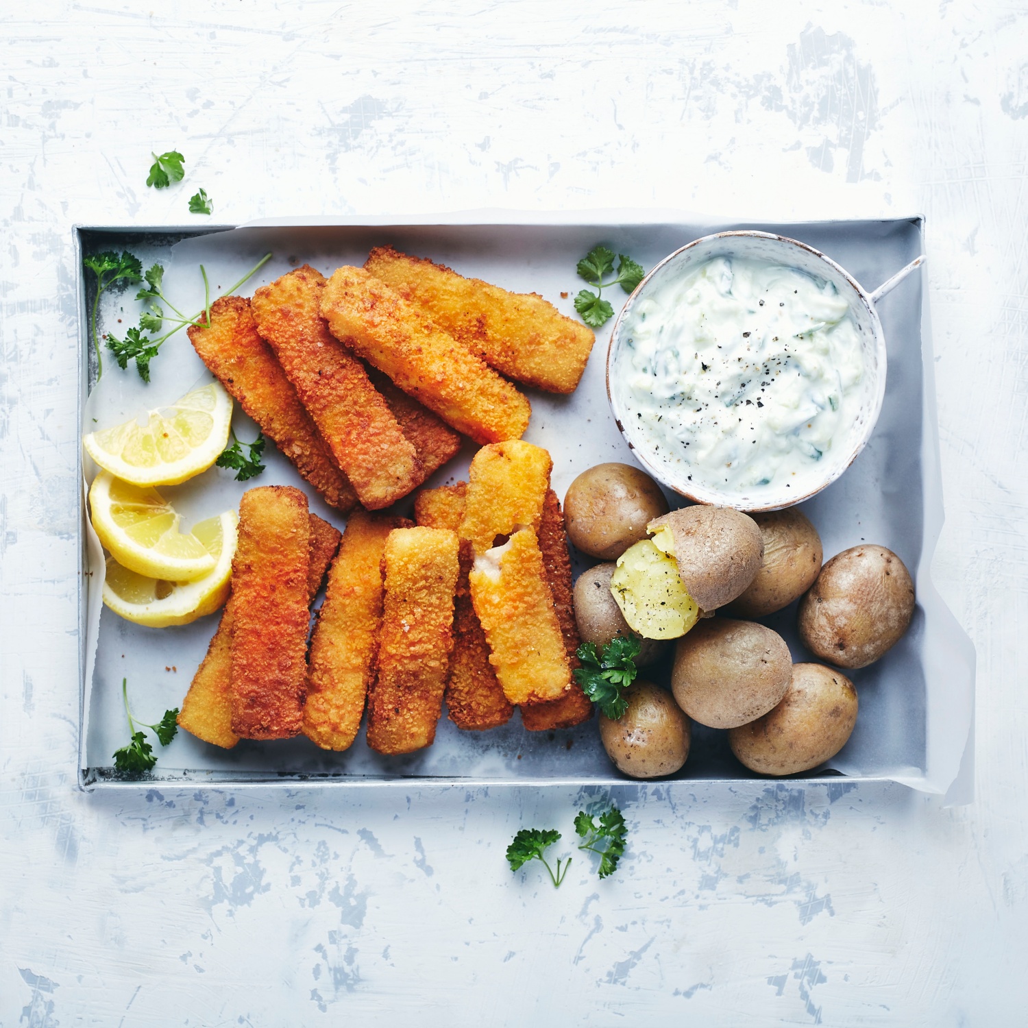 Gebratener Fisch (Fischstäbchen) mit leichtem Gurken-Joghurt-Dip