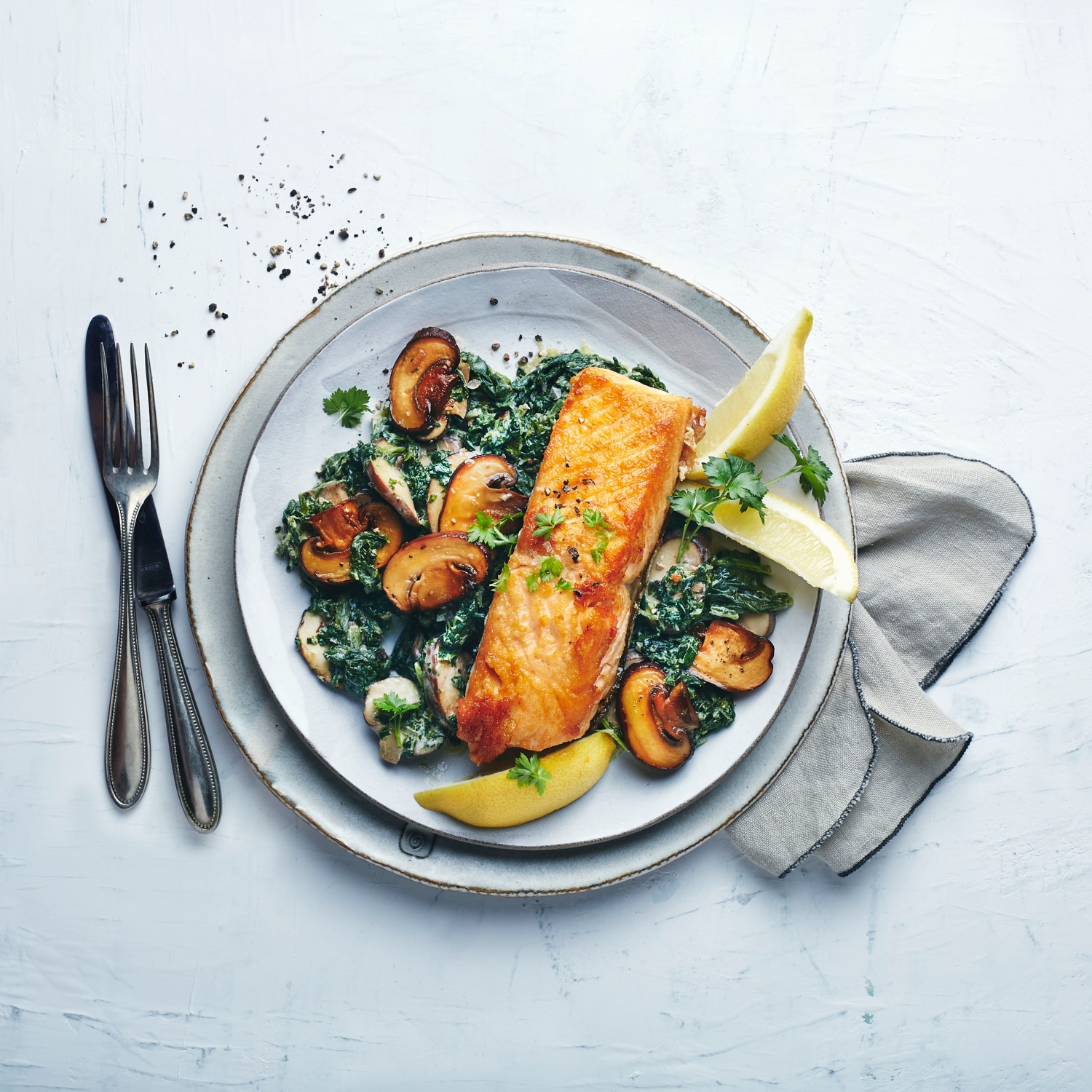 - Die Lachsfilets auf dem Spinat-Champignon-Bett anrichten. Die Zitrone in Spalten schneiden und als Deko platzieren. Mit frischer Petersilie garniert servieren.
