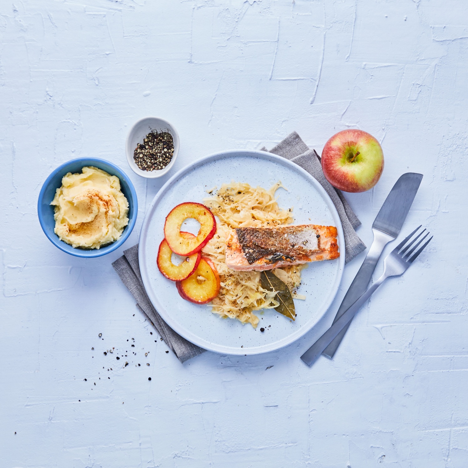 - Die Äpfel mit dem Sauerkraut füllen und zusammen mit dem gebratenen Lachs anrichten. Dazu schmecken Bratkartoffeln oder Kartoffelpüree.