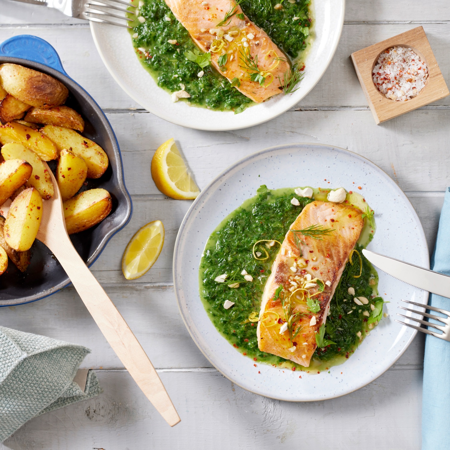 Ein komplettes, gesundes und schmackhaftes Gericht. Kombiniert ausgewogen den Geschmack der intensiven Lachssäfte mit cremigem Spinat und ergänzt mit köstlichen Kartoffeln. Zum Rezept