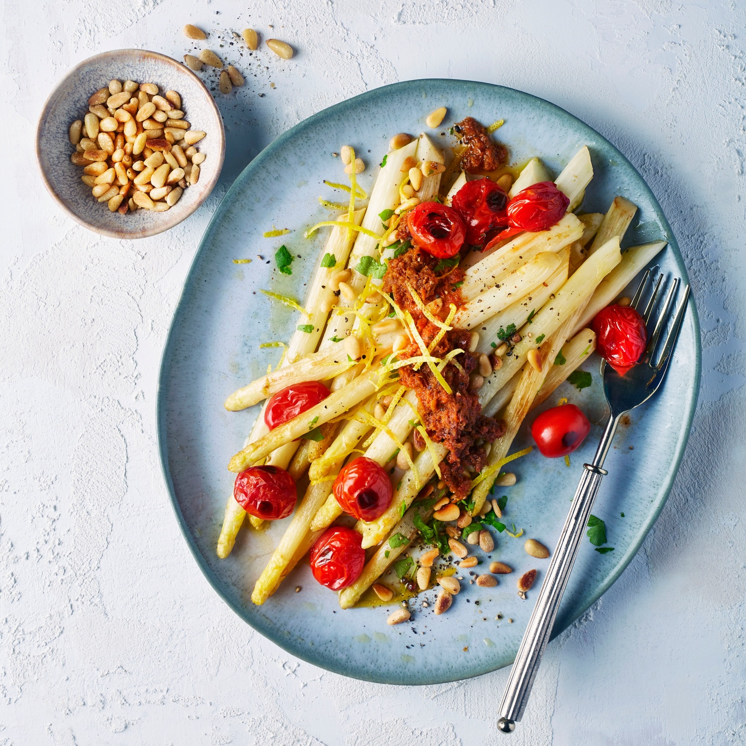 Gebratener Spargel mit Zitrone, Datteltomaten und Pinienkernen duftet herrlich und lädt zu einem kulinarischen Hochgenuss ein. Zum Rezept
