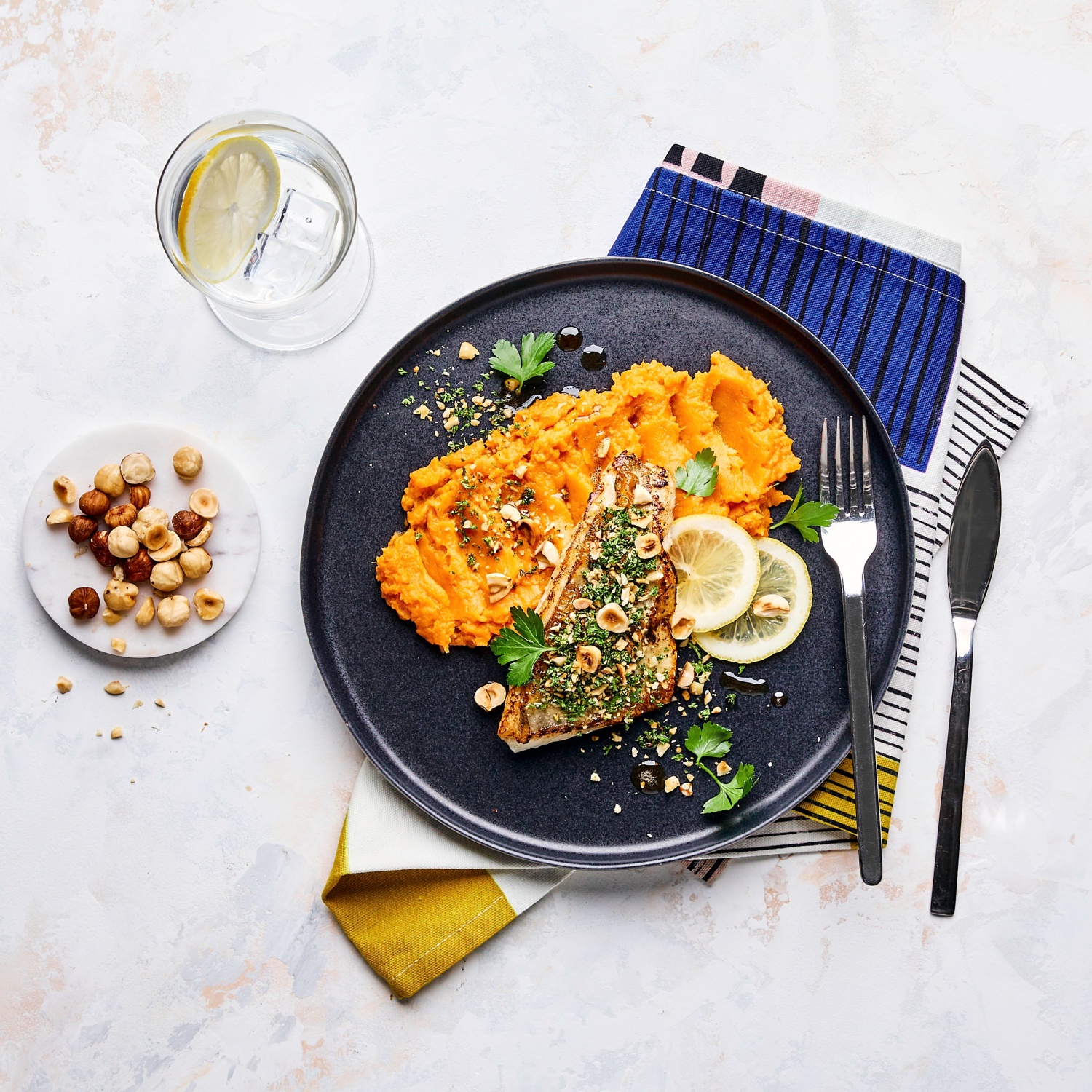 Perfekte Harmonie: Kross gebratener Zander, getoppt von einem feinen Crunch von Haselnuss und Petersilie auf Süßkartoffelstampf. Ein Geschmackserlebnis, das begeister. Zum Rezept