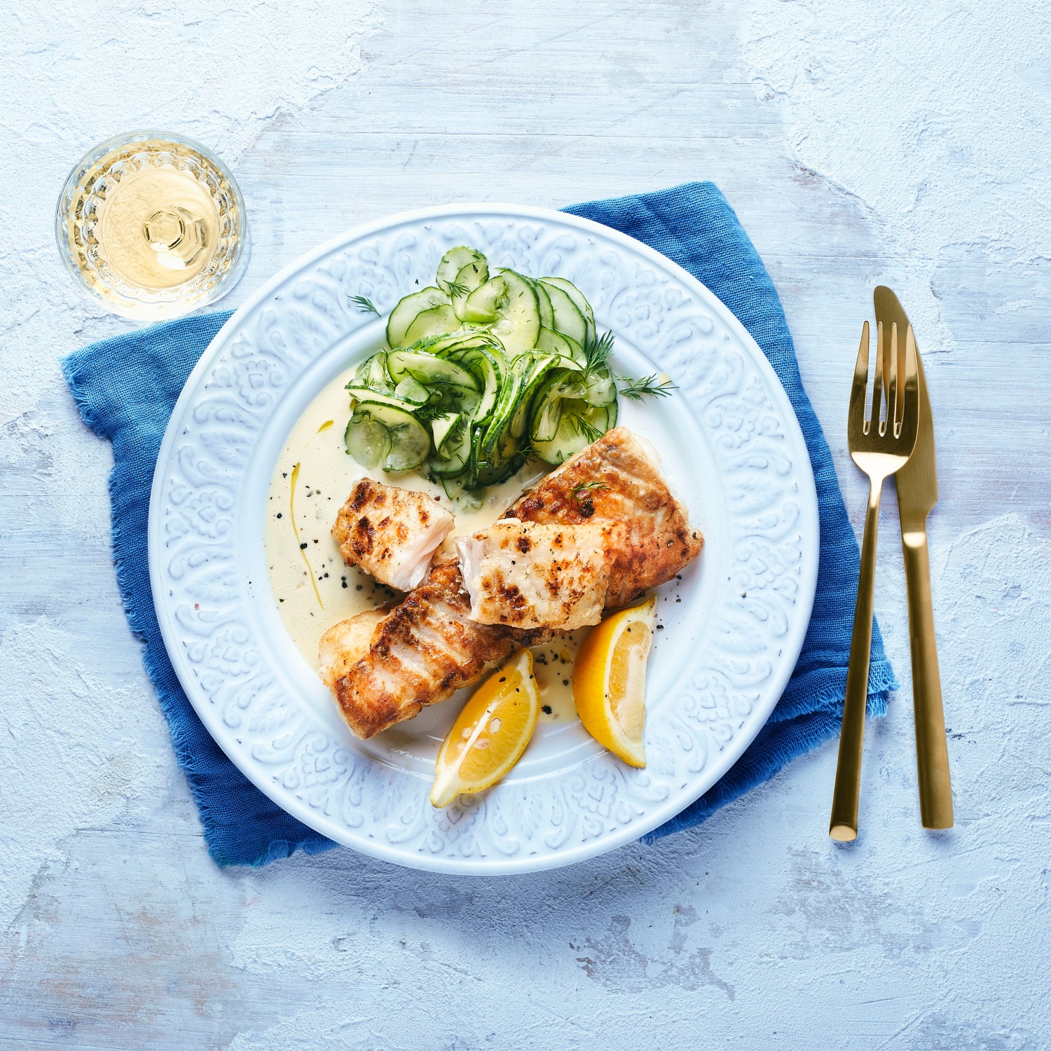 5. Das Kabeljaufilet mit der Senfsoße anrichten und mit Zitronenspalten garnieren.